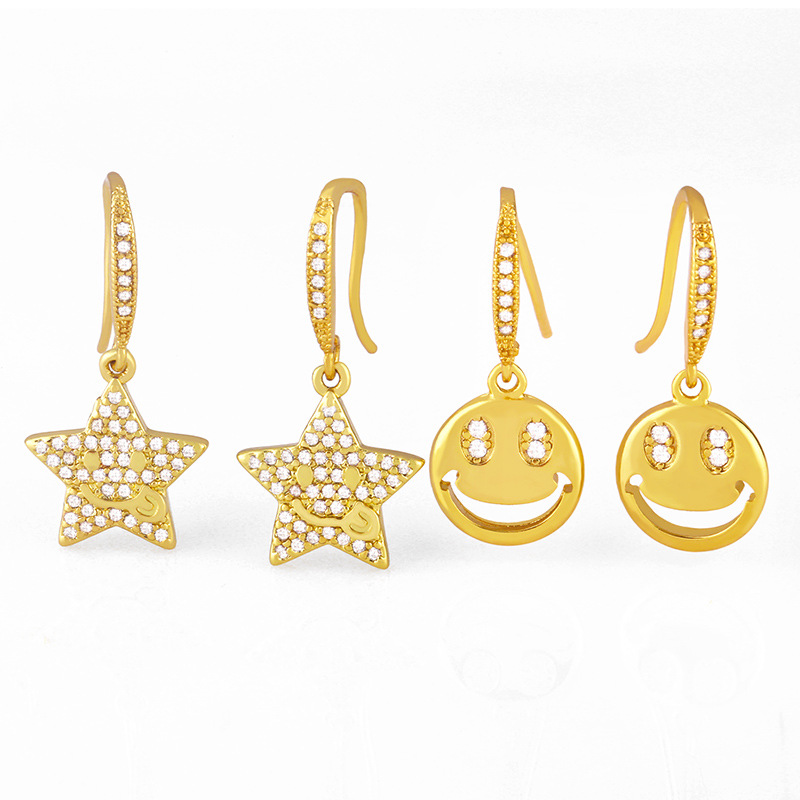 Brincos redondos criativos com smiley, joias europeias e americanas, com zircônia incrustada, estrela de cinco pontas, gancho de orelha feminino erx38
