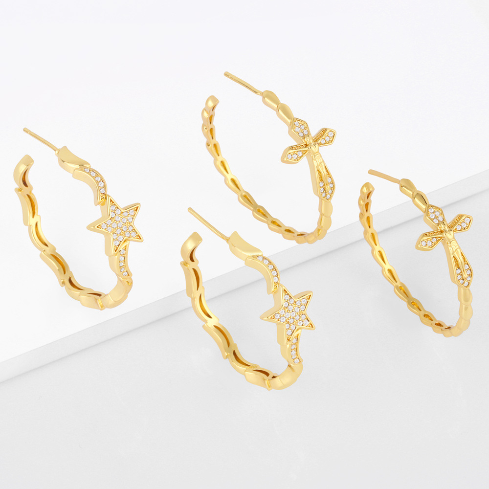 Brincos de estrela e lua em liquidação para mulheres, brincos europeus e americanos leves, luxuosos, geométricos em forma de C, brincos de estrela de cinco pontas ocas com diamante erz59