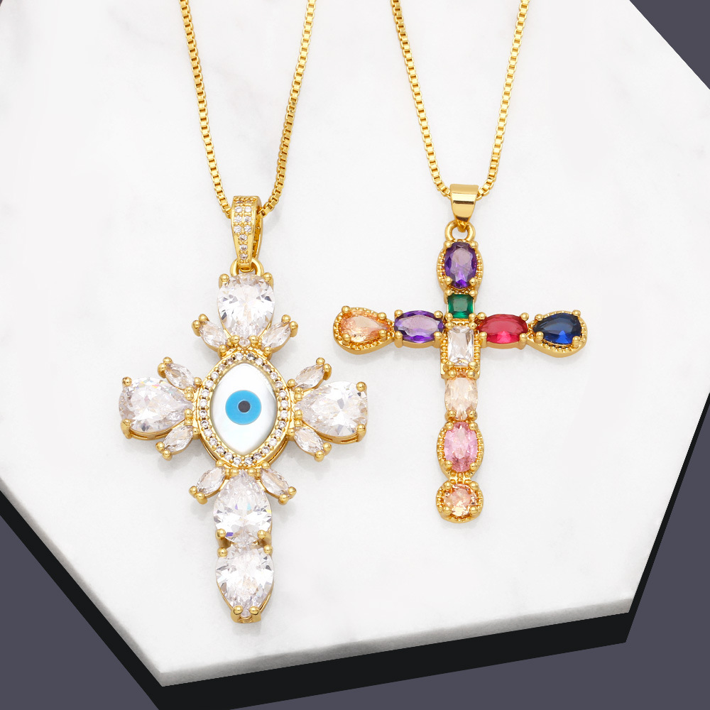 Colar de cruz de olho de personalidade criativa feminino estilo europeu e americano pingente de cruz de zircônia colorida nkb443
