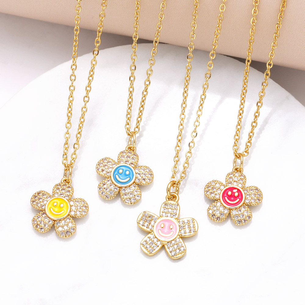 liquidação como colar de flores de joias banhado a cobre ouro verdadeiro pingando rosto sorridente zircônia corrente de clavícula nkb275