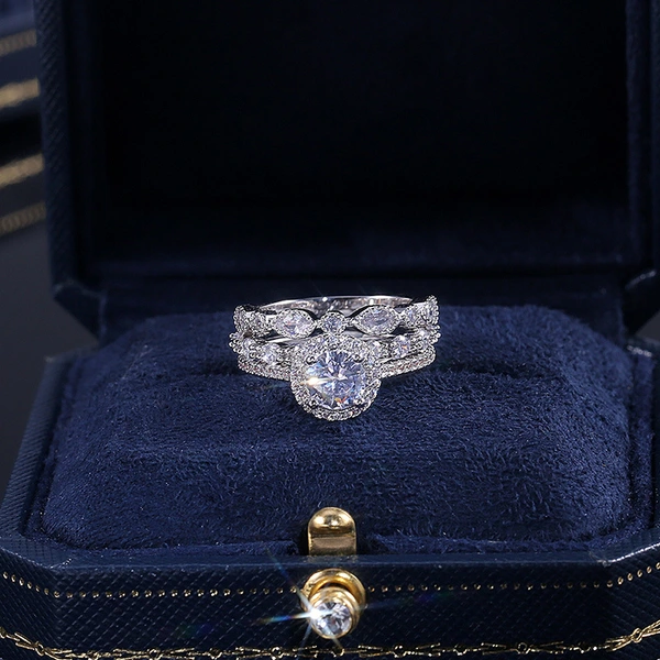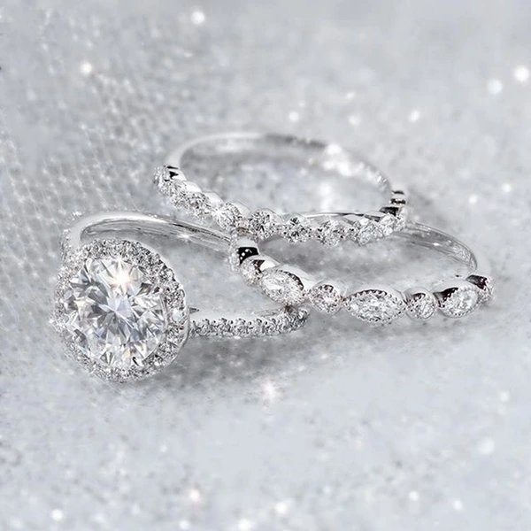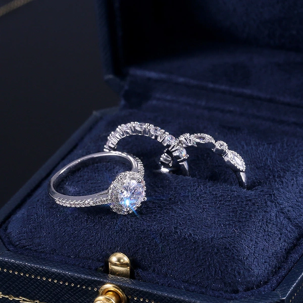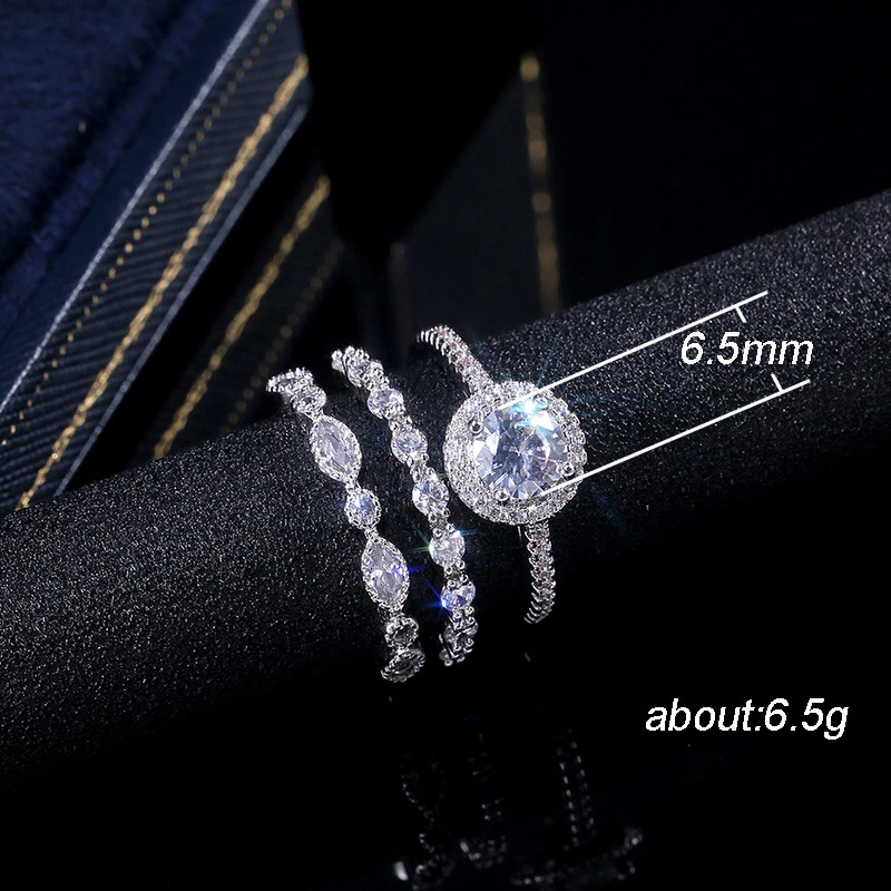 Conjunto de anéis de combinação de três peças com zircónias e diamantes banhados a platina, joias populares europeias e americanas, anéis de moda por atacado
