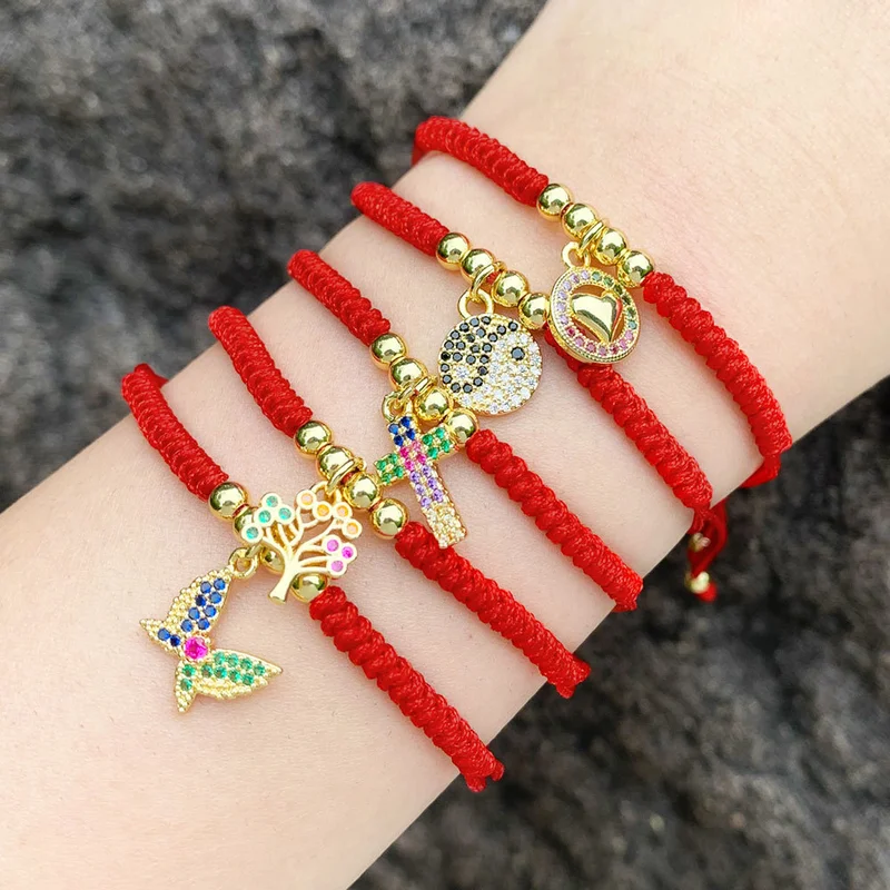 Joias europeias e americanas personalizadas com microincrustações de zircônia colorida, borboleta, árvore da vida, pingente de amor, pulseira de corda vermelha brc82