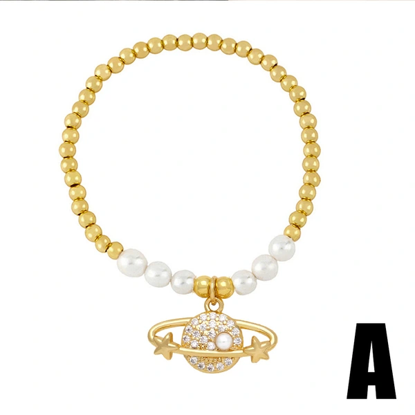Pulseira feminina com 26 letras em inglês, contas de cobre europeias e americanas, pulseira elástica de pérolas, pulseira fashion com letras de coroa brf80