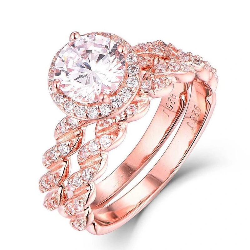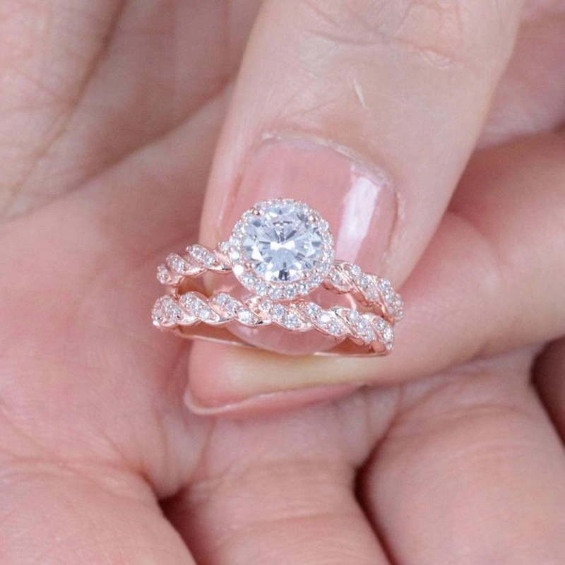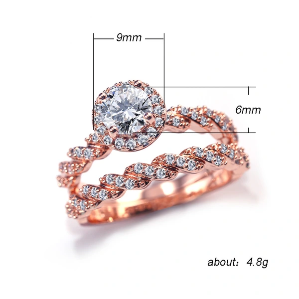 Anel clássico de quatro garras com microincrustações de zircónias sintéticas, anel de braço torcido de duas cores com fileira dupla para mulher, anel de noivado e casamento