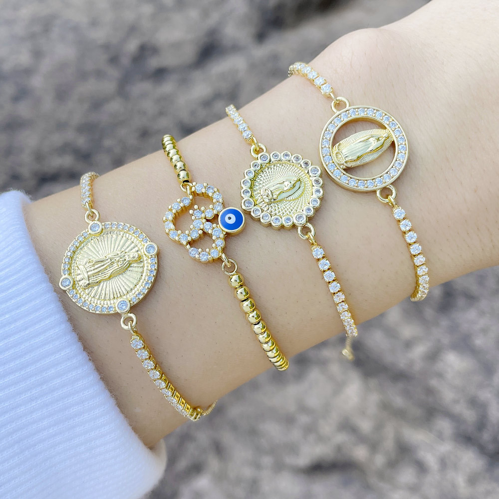 Pulseira virgem maria em liquidação madrepérola incrustada com diamantes coloridos placa redonda corrente grossa nicho pulseira feminina bre67