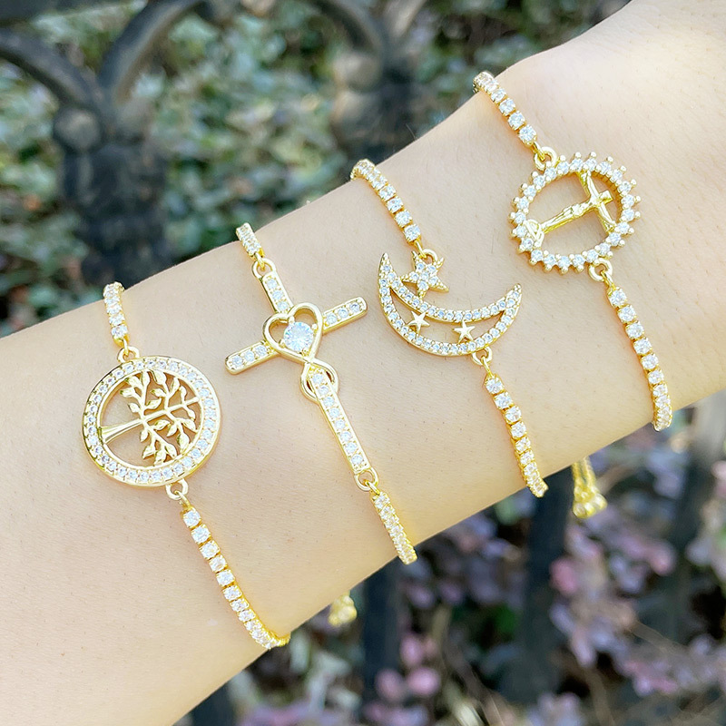 Pulseira de namorada de celebridade da internet com design de nicho, pulseira de zircônia simples com cruz e árvore da vida, joias europeias e americanas bre15