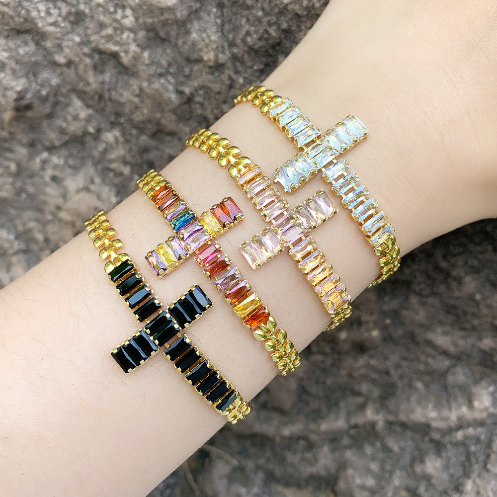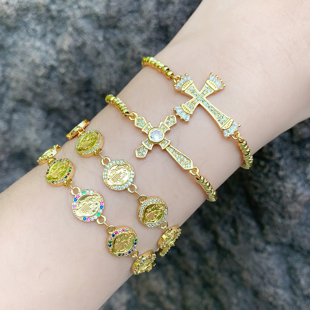 Pulseira feminina estilo europeu e americano com cruz de nossa senhora, pulseira simples de diamante e zircônia, joias de mão ajustáveis ​​brb39