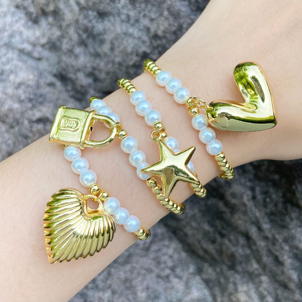 pulseira de joias coração pérola pulseira banhada a ouro estrela cadeado contas mão jóias bre69