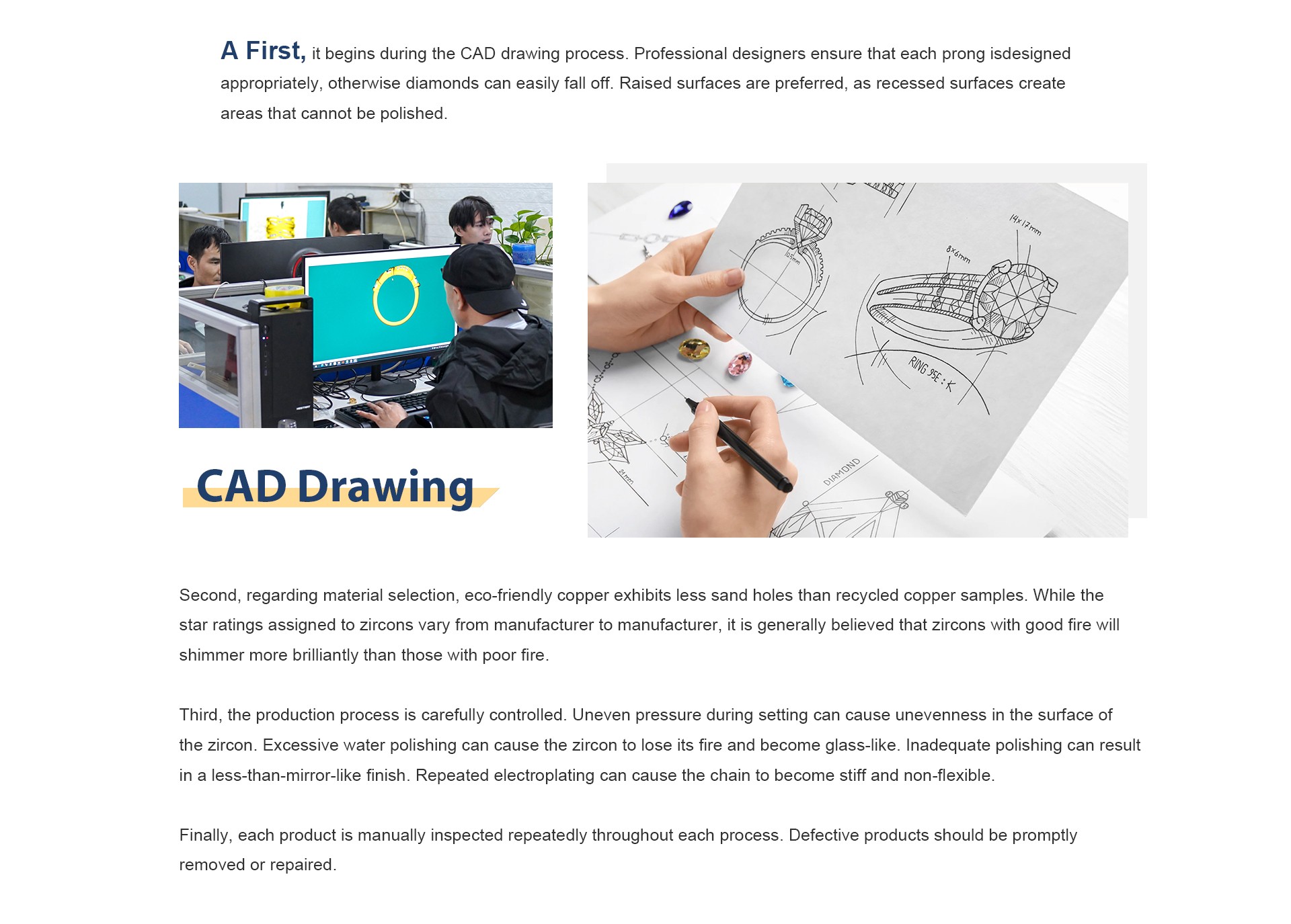 First, it begins during the CAD drawing process. Professional designers ensure that each prong is designed appropriately, otherwise diamonds can easily fall off. Raised surfaces are preferred, as recessed surfaces create areas that cannot be polished.