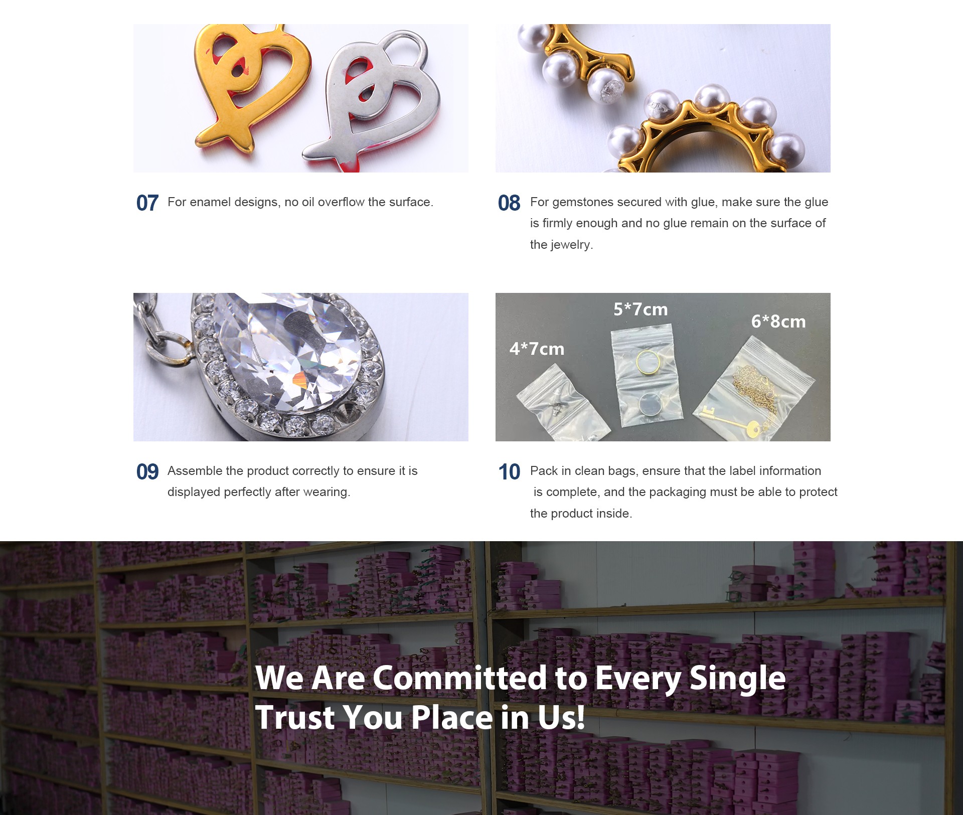 8. For gemstones secured with glue, make sure the glue is firmly enough and no glue remain on the surface of the jewelry.