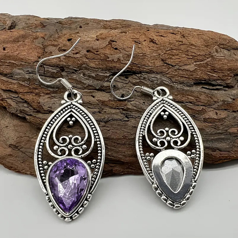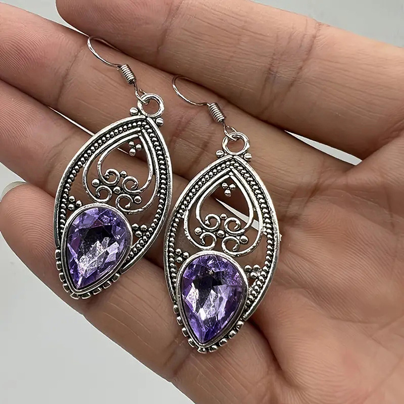 Retro alloy hollow purple earrings personality teardrop-shaped pendant ear hook floral design earrings