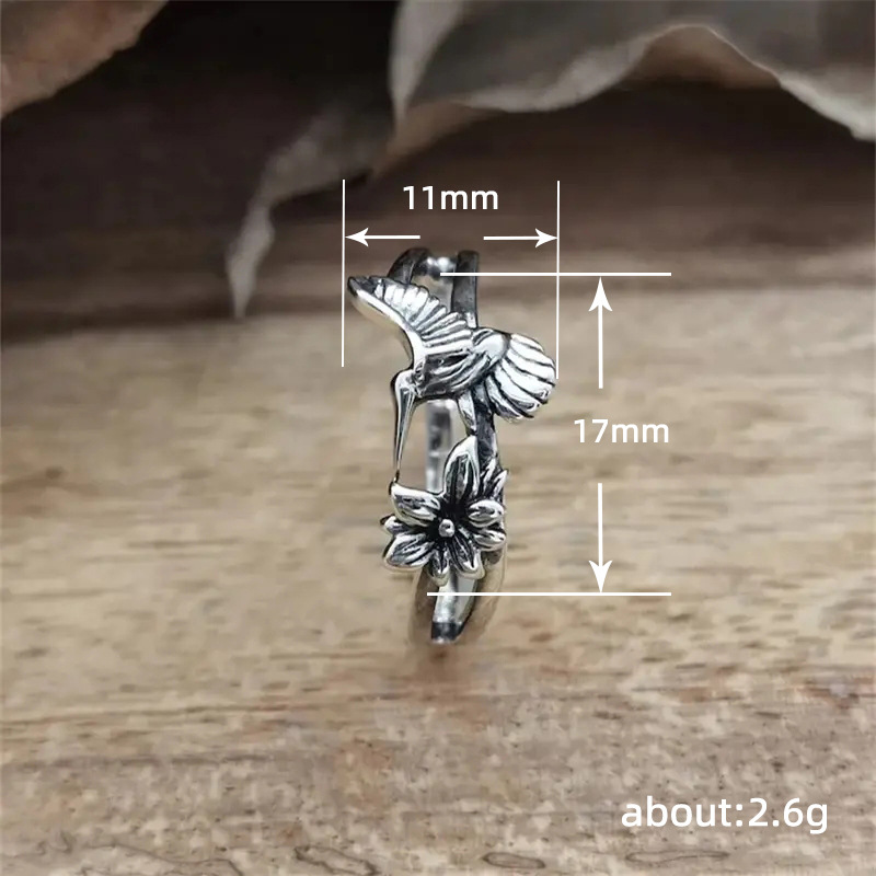 Retro old new jewelry literary fresh flower simple hummingbird ring ancient silver blackened ring