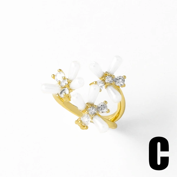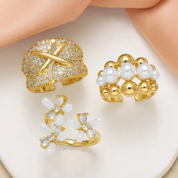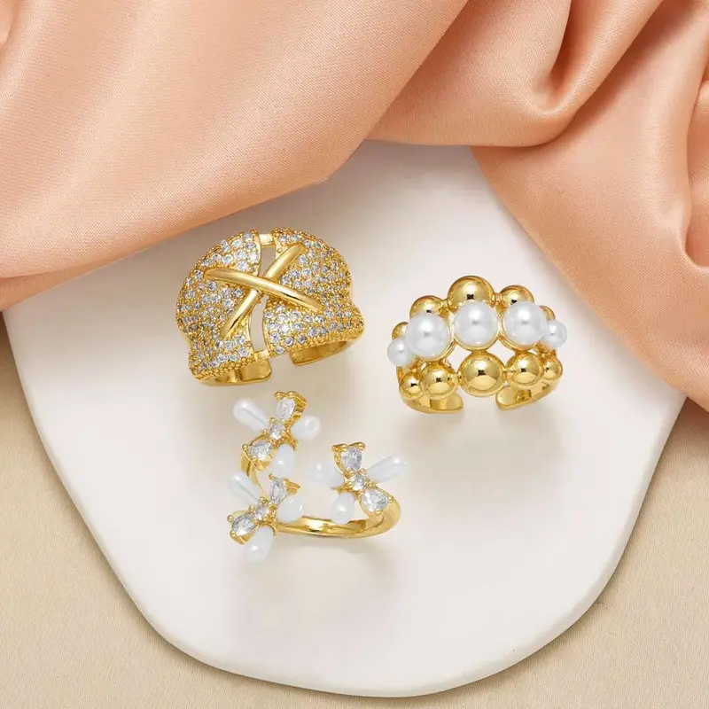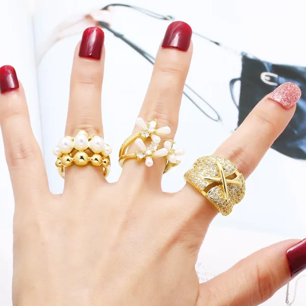 Женское кольцо с цветком из европейского и американского жемчуга, полностью покрытое цирконием, 18-каратное золотое открытое кольцо riq85
