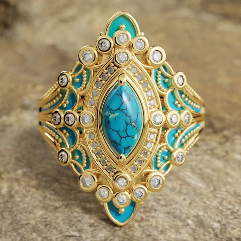 Кольцо в британском стиле для женщин, имитация бирюзы, металлическая роспись с эффектом «лошадиный глаз», изысканные украшения для банкета благородной дамы