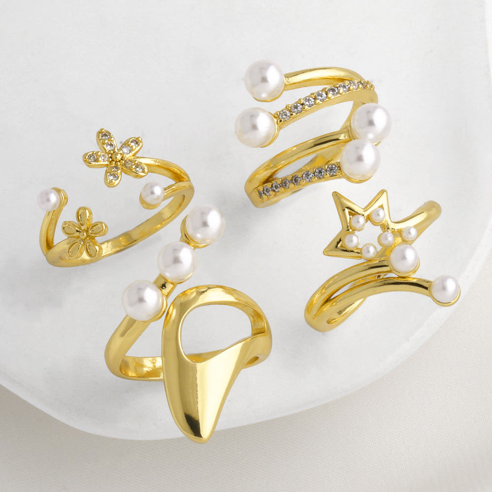 Новое открытое кольцо с жемчужиной, женское, медное, золото 18 карат, регулируемое кольцо с цветком и звездой, как ювелирное украшение, ris37