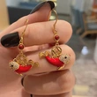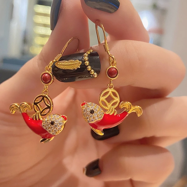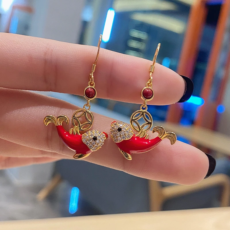 Серьги в стиле национального дворца приливов с красным клеем кои, легкие, роскошные, простые, с подвеской в ​​виде денег, маленькие серьги-рыбки