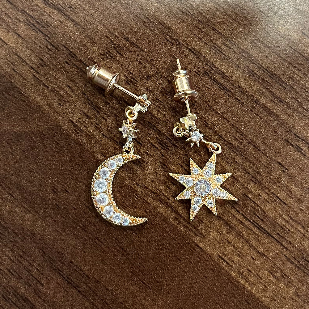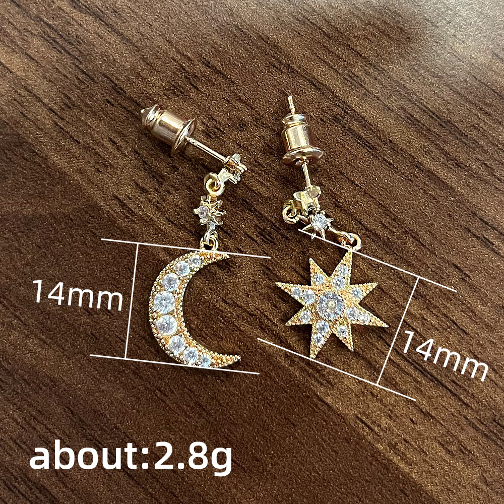 Starry crescent moon asymmetrical earrings for women, internet celebrity style, goddess style, shining earrings