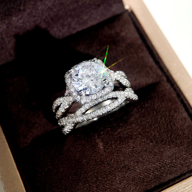 Classic four-claw imitation zircon micro-inlaid ring women's double row two-color twist arm ring engagement wedding ring women