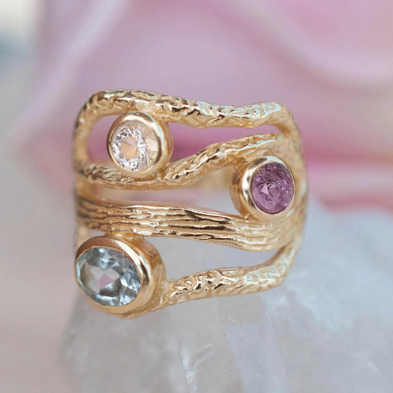 Three moonlight-colored imitation gemstone rings with gradient colors, geometric multi-layer lines, exquisite and luxurious rings