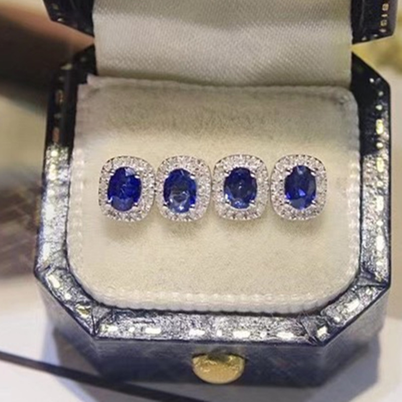 Vintage earrings, court French elegant small earrings, copper inlaid four-claw oval sapphire blue zircon mini earrings