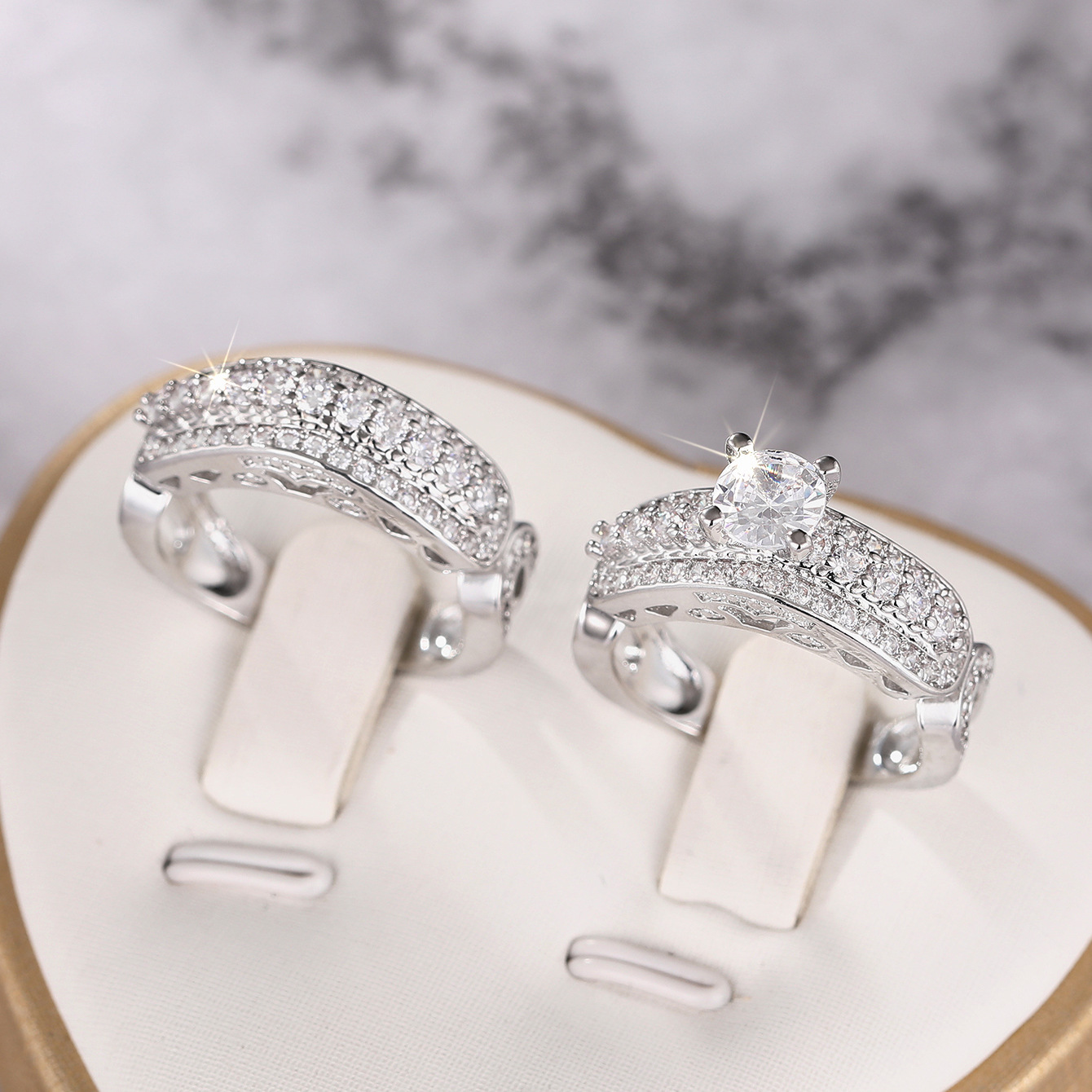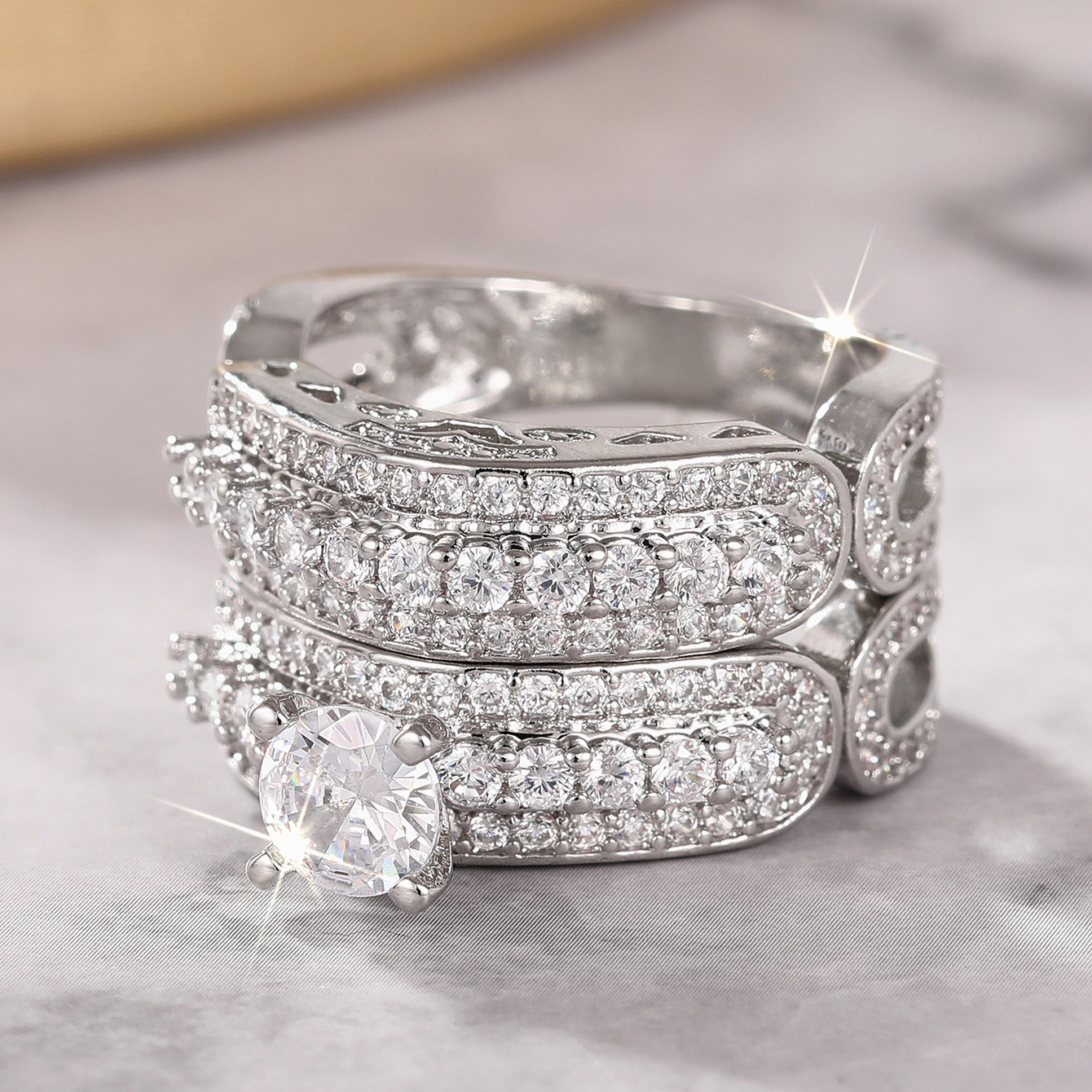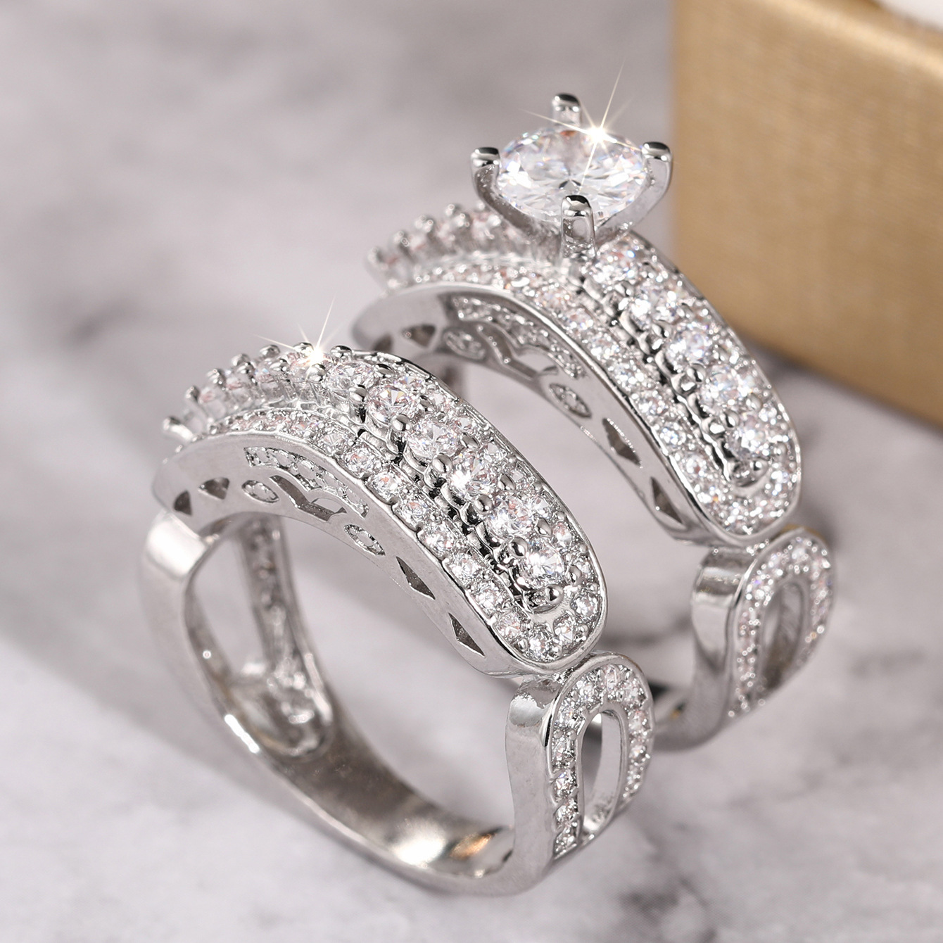 Wedding stacking ring two-piece set for women, micro-inlaid zircon geometric jewelry, elegant four-claw inlaid couple rings