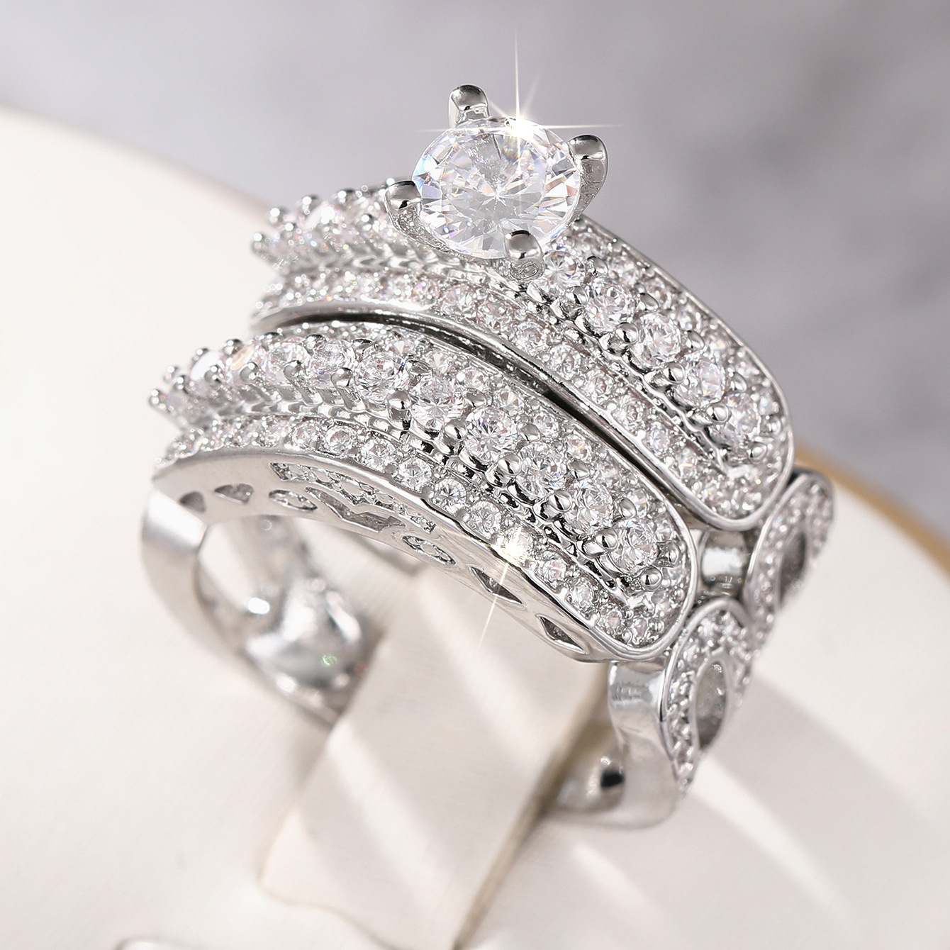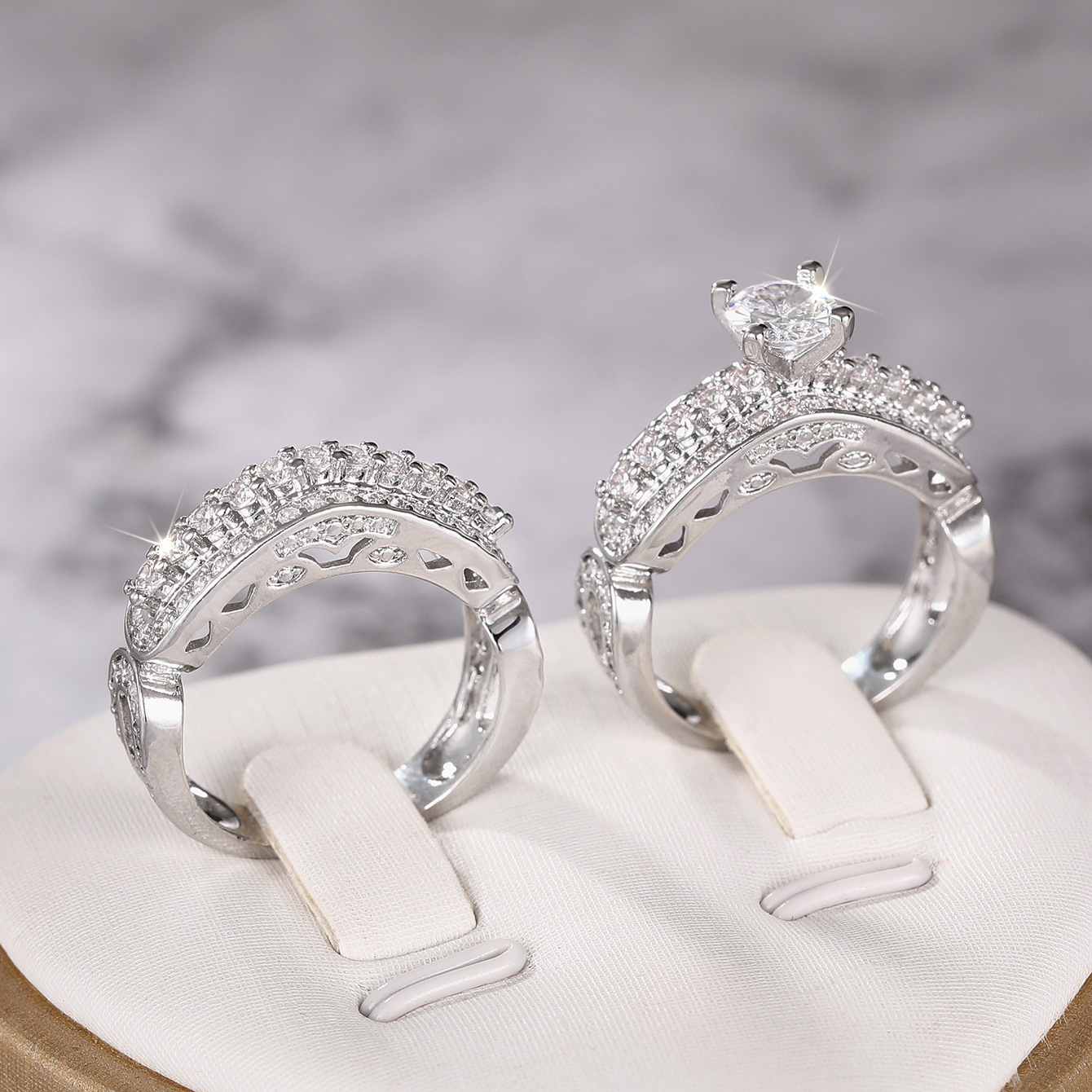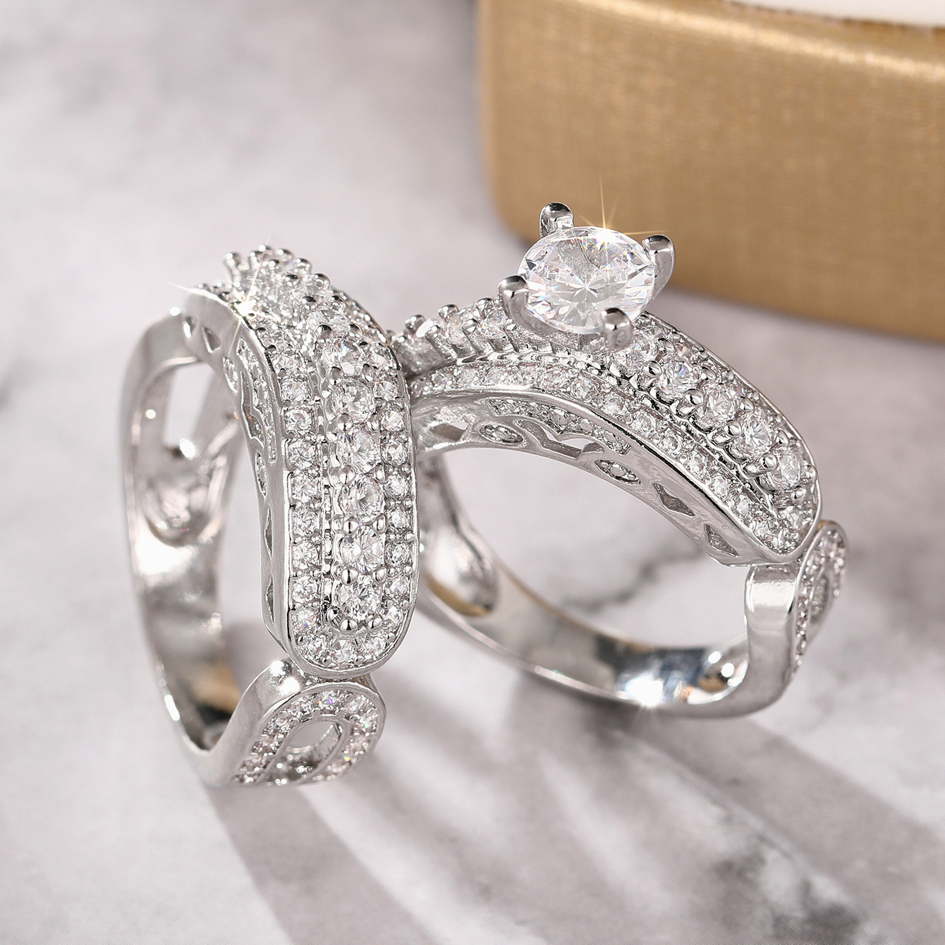 Wedding stacking ring two-piece set for women, micro-inlaid zircon geometric jewelry, elegant four-claw inlaid couple rings